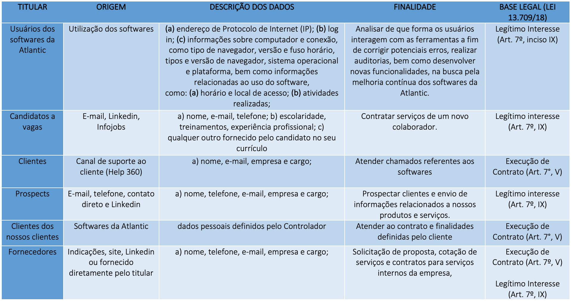 (i) “Bases Legais” são as hipóteses legais que autorizam a Atlantic Solutions e seus clientes a tratar Dados Pessoais. Todo e qualquer tratamento de Dados Pessoais é considerado válido se tiver fundamento em uma base legal.
